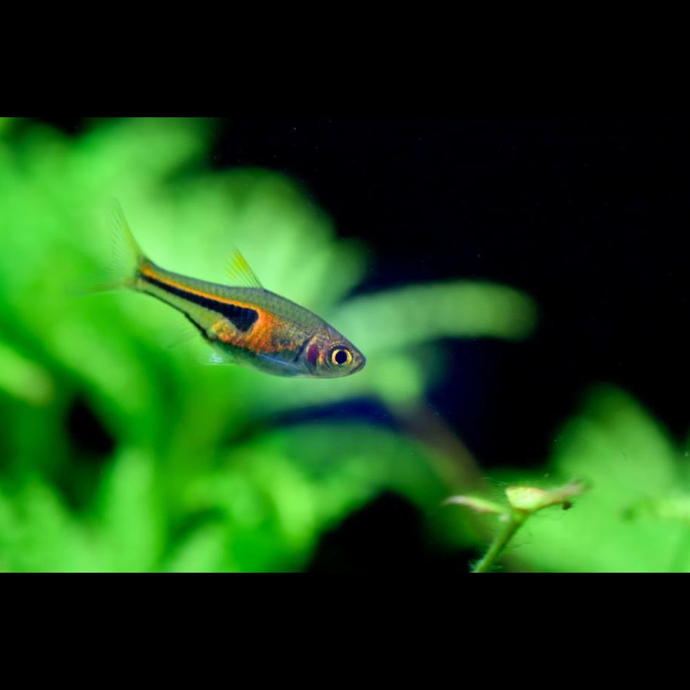 Charakteristika: Nádherná malá rybka vhodná do miniakvárií. Na rozdíl od razbory klínoskvrnné má přes tělo zářivě oranžový pruh, dorůstá menší velikosti a je těžší ji sehnat.