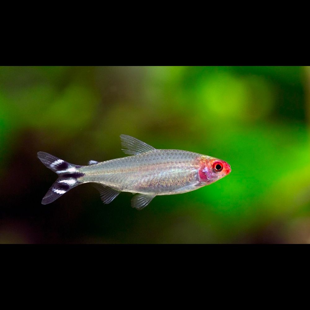 Charakteristika: Jak už název napovídá, má výrazně červené zbarvení hlavy (zvláště v období tření). Tělo je stříbrné barvy, ocasní ploutev má 3 černé a 4 bílé proužky. Pro chov jí vyhovuje menší až středně velké akvárium, hustě zarostlé rostlinkami, vhodné je spíš tmavší dno.