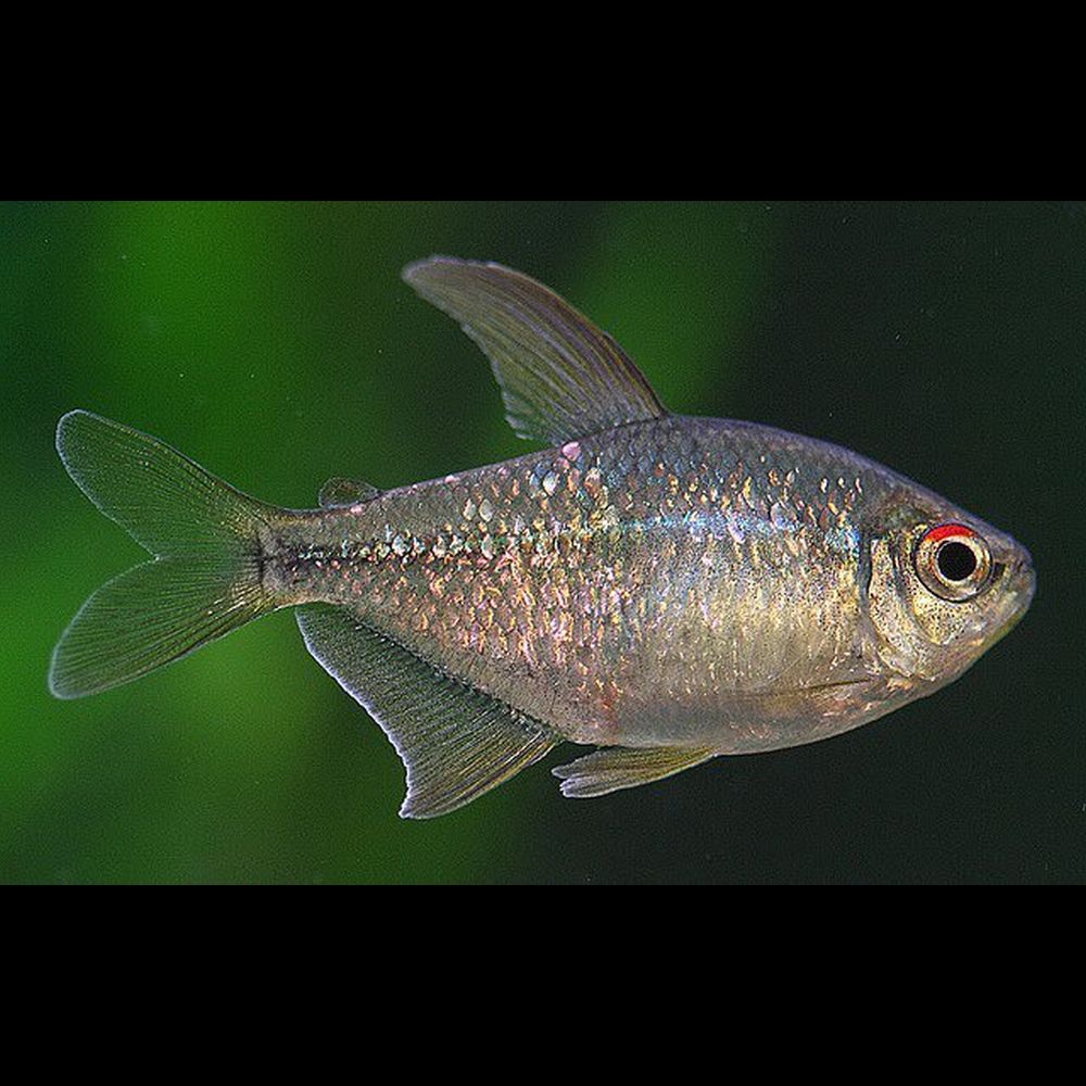 Zbarvení je stříbřité, na hřbetě šedavé, břicho bělavé. Boky jsou posety namodralými kovově blýskavými tečkami. Ploutve jsou šedé, bíle obroubené. Horní část duhovky oka je červená. Celkové vybarvení při dopadajícím světle je nádherně stříbřitě lesklé. Nejsou-li rybky chovány v houfu nebo ve společnosti jiných ryb, stávají se plachými.Tyto společenské, čilé a mírumilovné rybky vyžadují dobře osázené prosvětlené akvárium.